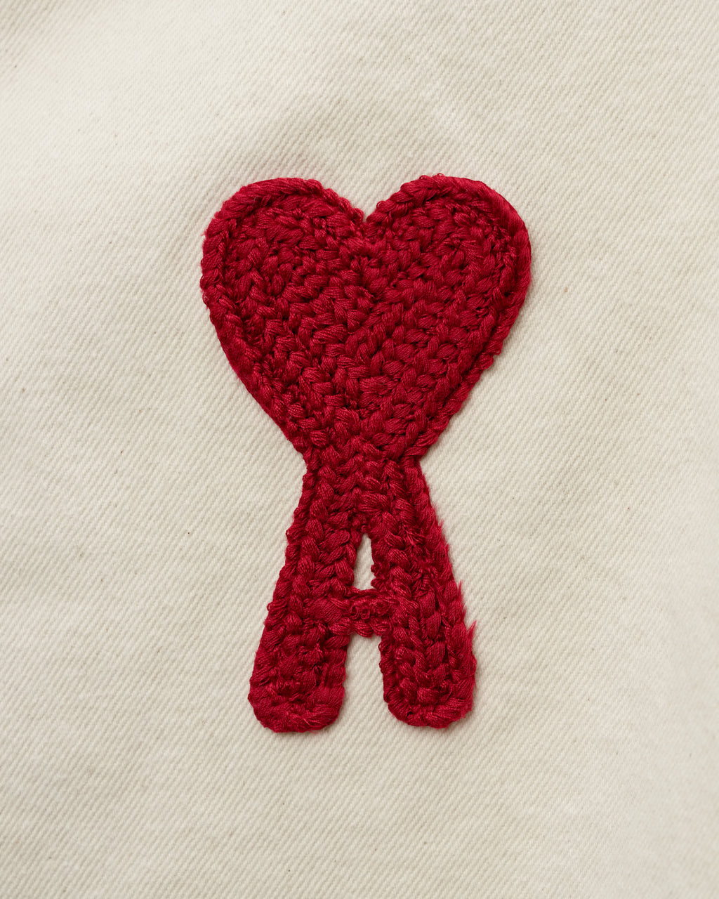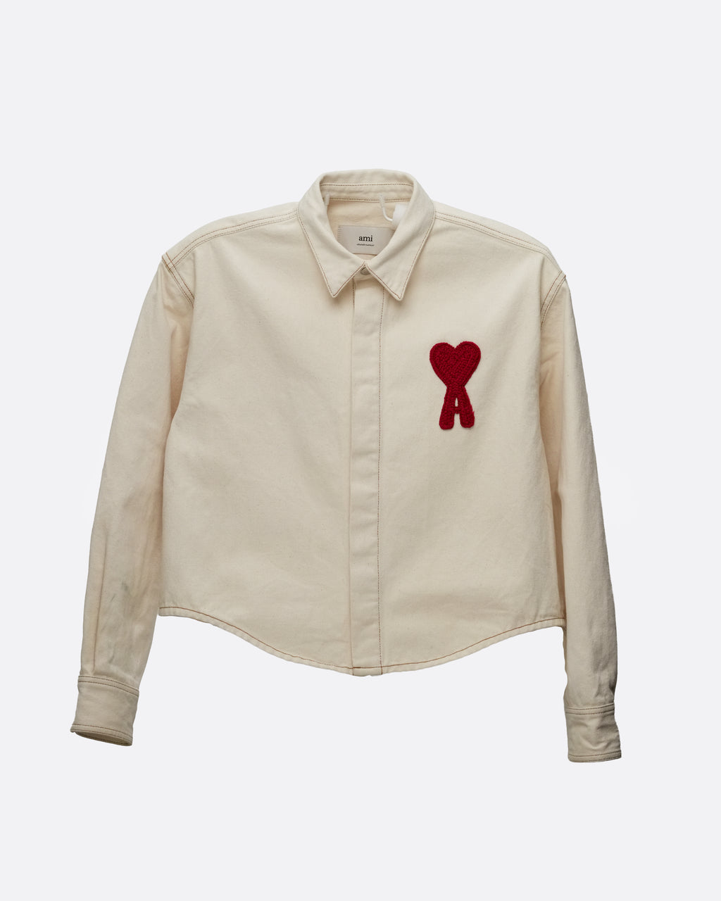 AMI Alexandre Mattiussi oversized cotton denim jacket in ivory. Casual yet refined with the signature red Ami de Cœur logo, perfect for versatile everyday styling