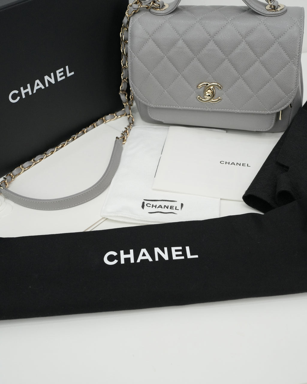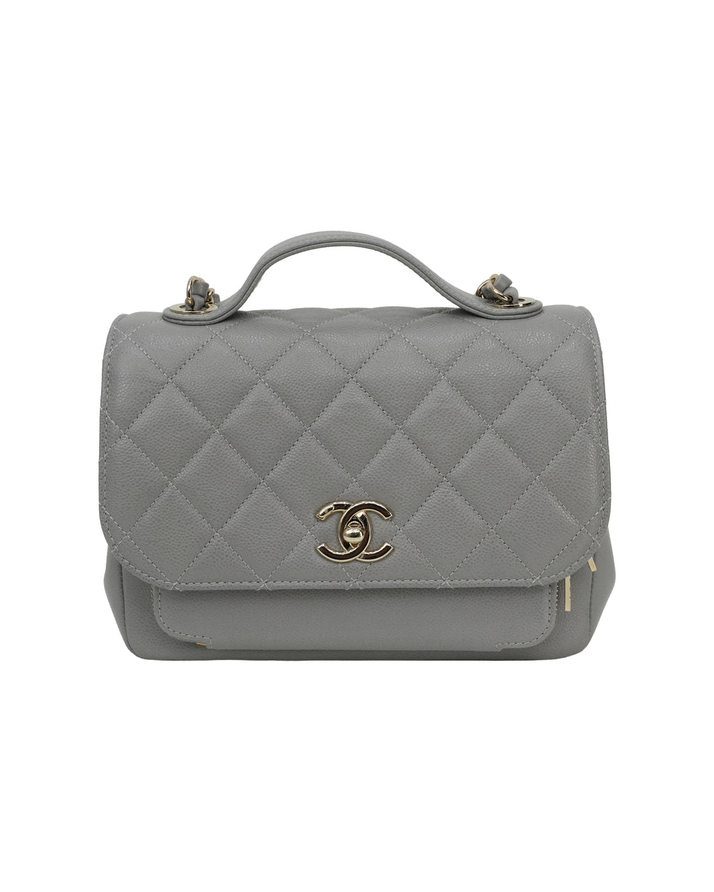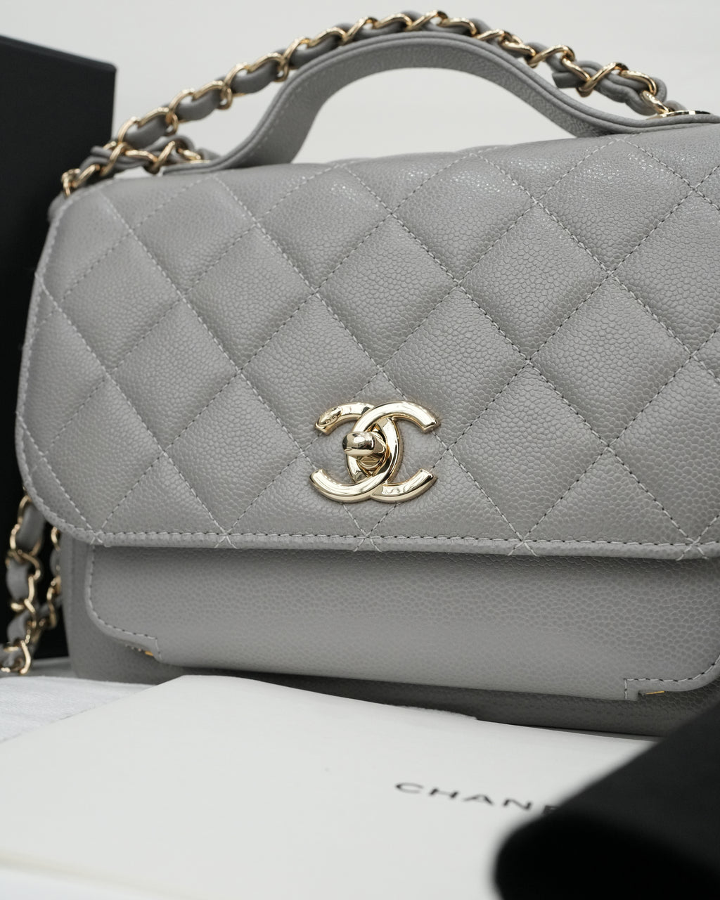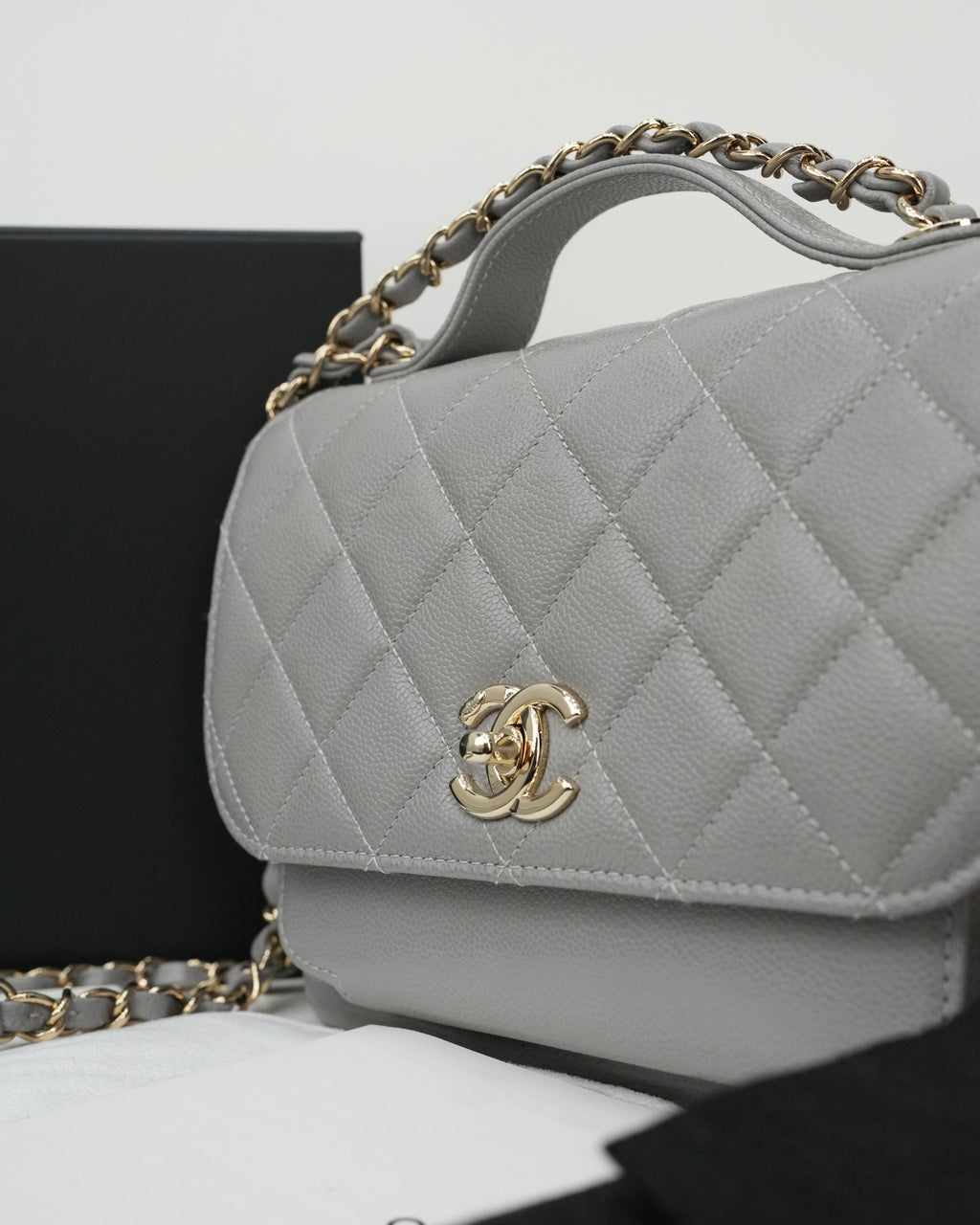 The Chanel Business Affinity Medium in grey caviar leather features classic diamond quilting, a structured top handle, and the signature CC turn-lock closure. Finished with light gold-tone hardware and a chain strap for elegant shoulder or crossbody wear.