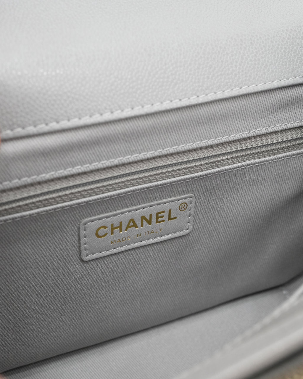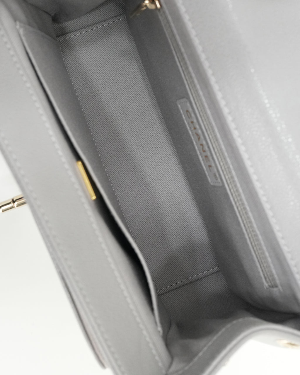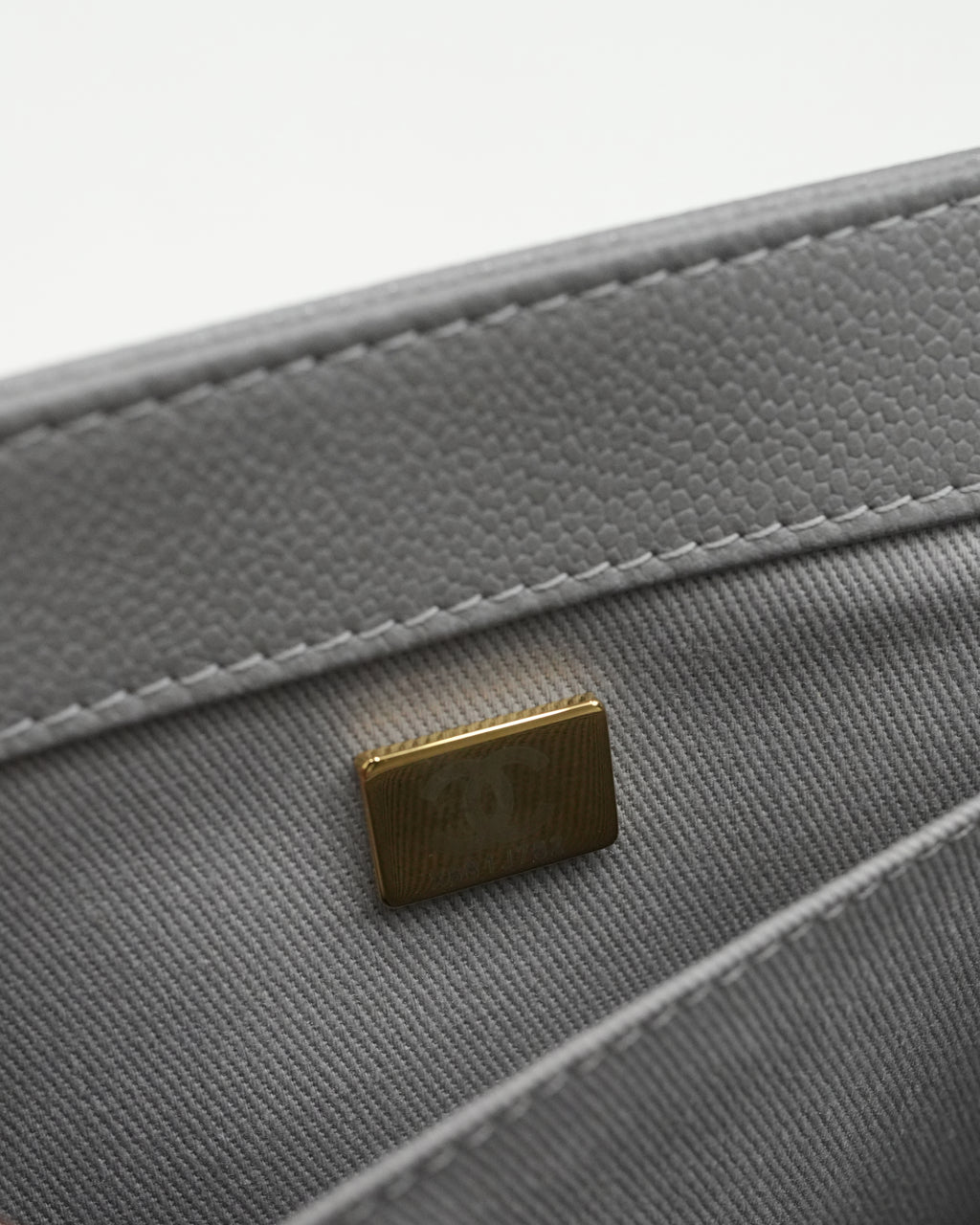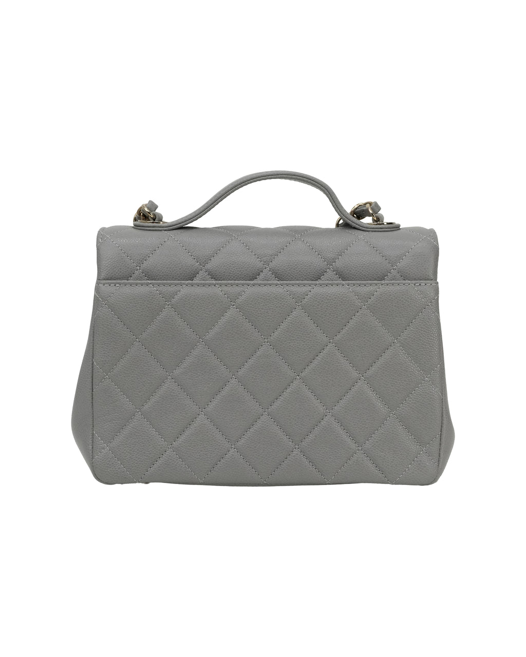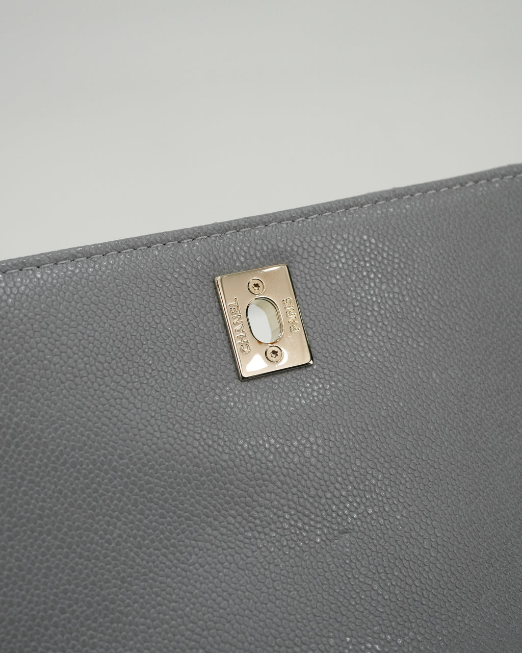 The Chanel Business Affinity Medium in grey caviar leather features classic diamond quilting, a structured top handle, and the signature CC turn-lock closure. Finished with light gold-tone hardware and a chain strap for elegant shoulder or crossbody wear.