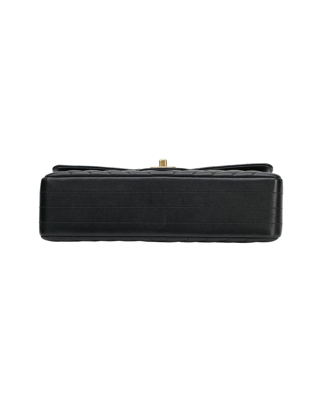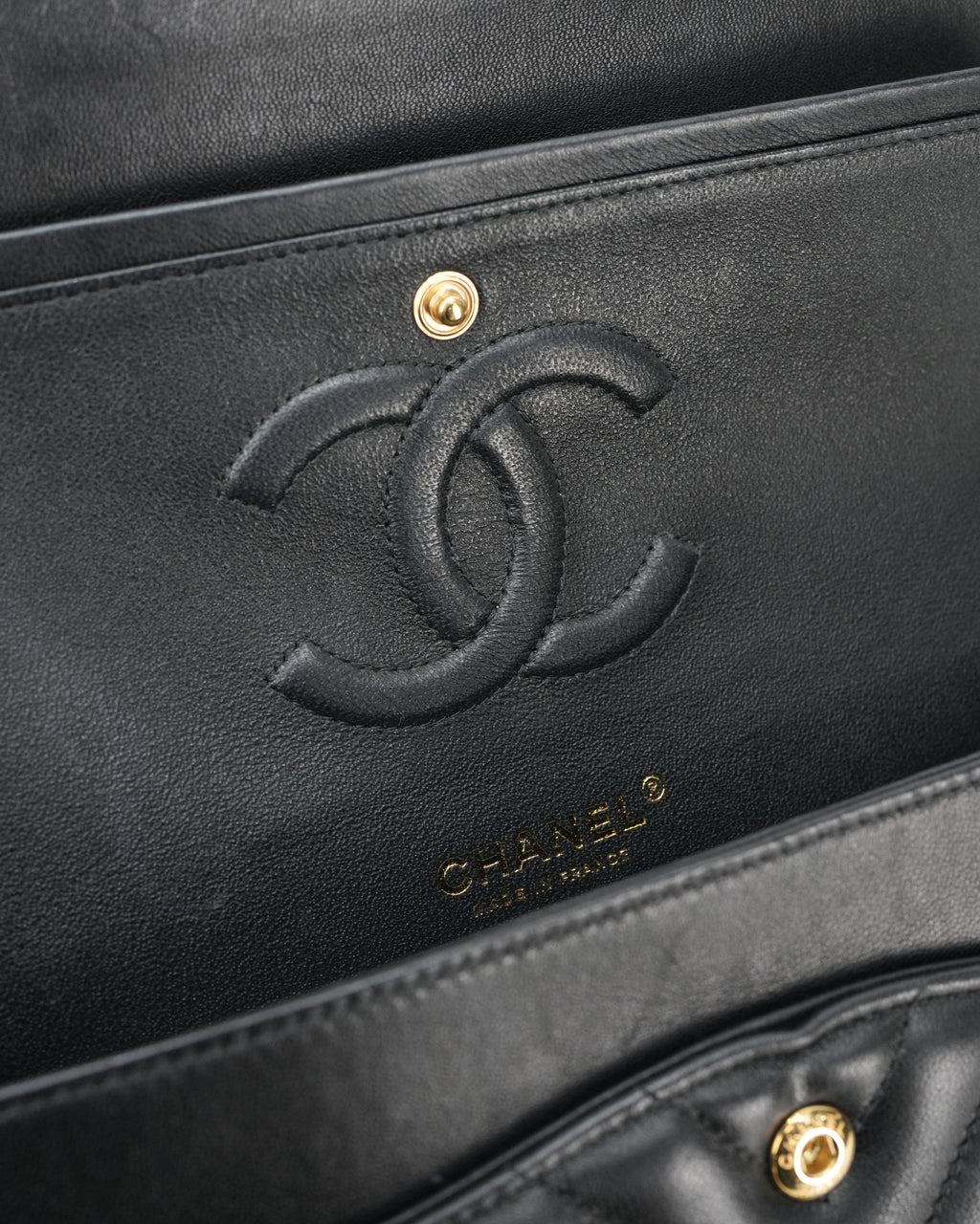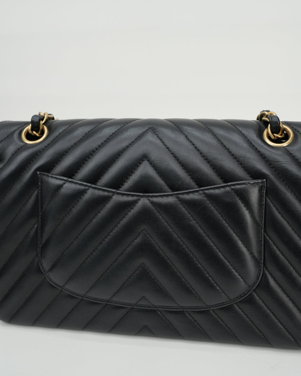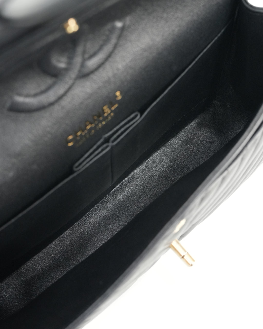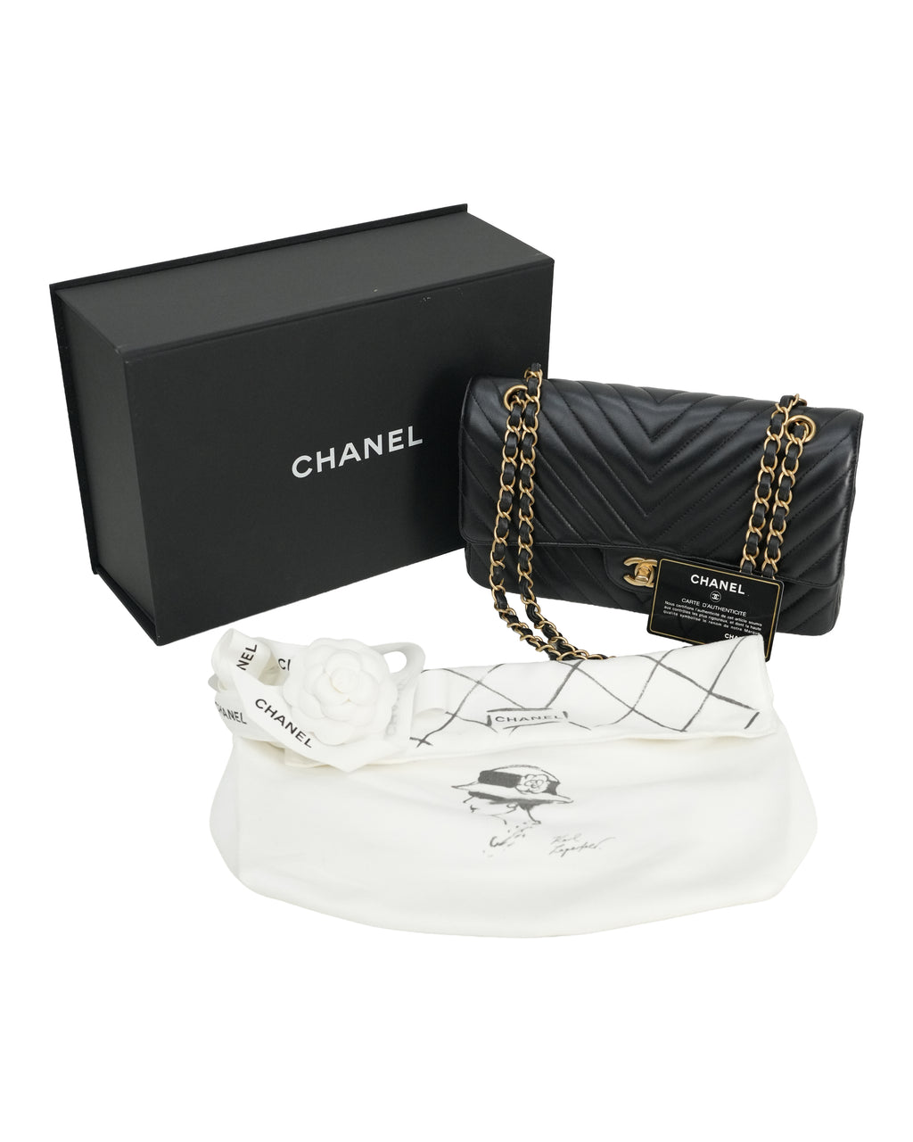 The Chanel Classic Medium Double Flap in black chevron lambskin features the iconic CC turn-lock closure and light gold-tone chain strap. Timeless and elegant, it offers structured compartments and versatile shoulder or crossbody wear.
