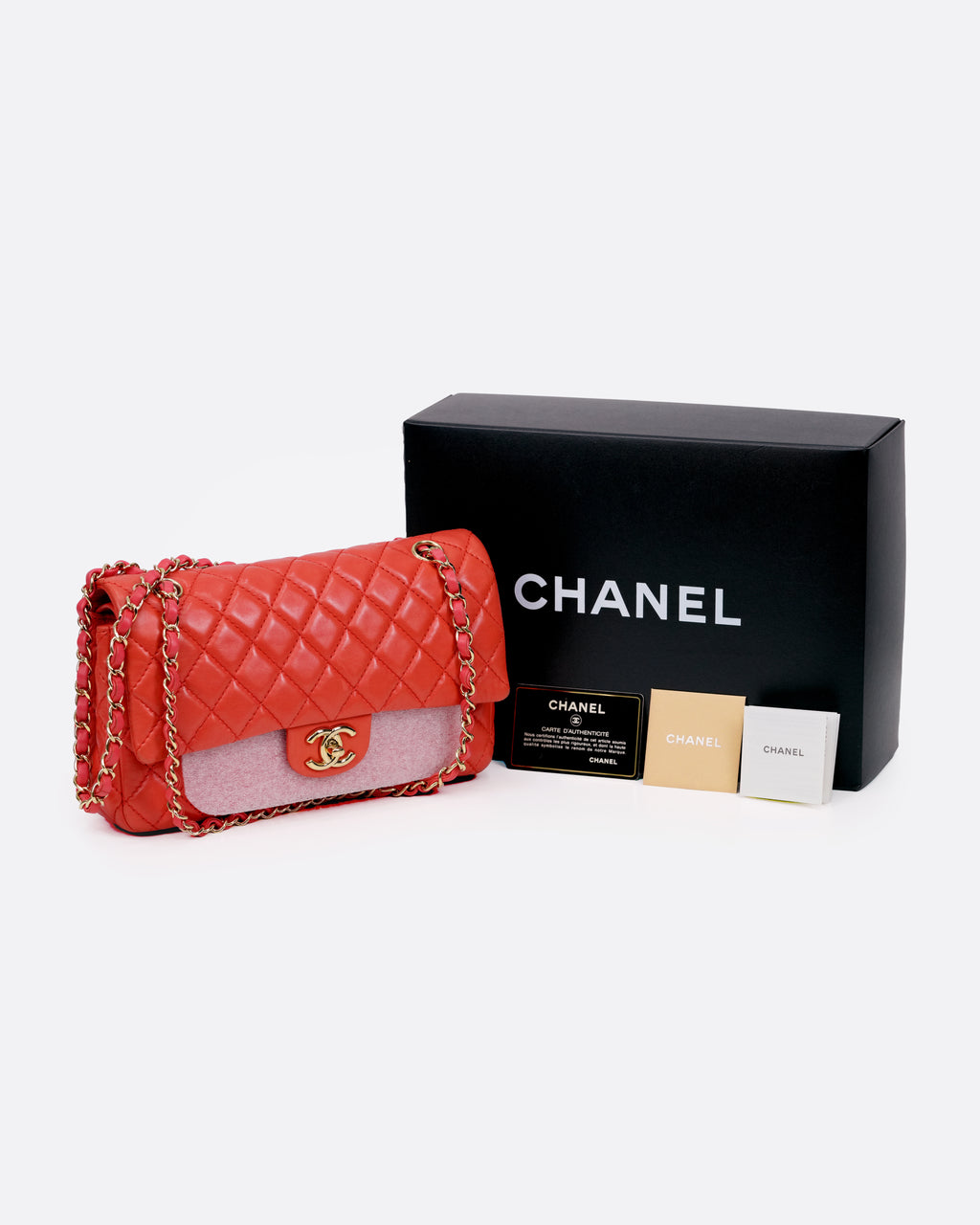 This CHANEL Classic Flap Medium is a rare gem in a vibrant yet refined coral red, beautifully complemented by gold-tone hardware. A forever piece in any luxury wardrobe, it features the iconic CC turn-lock, diamond quilted leather, and double flap design for added elegance and structure.