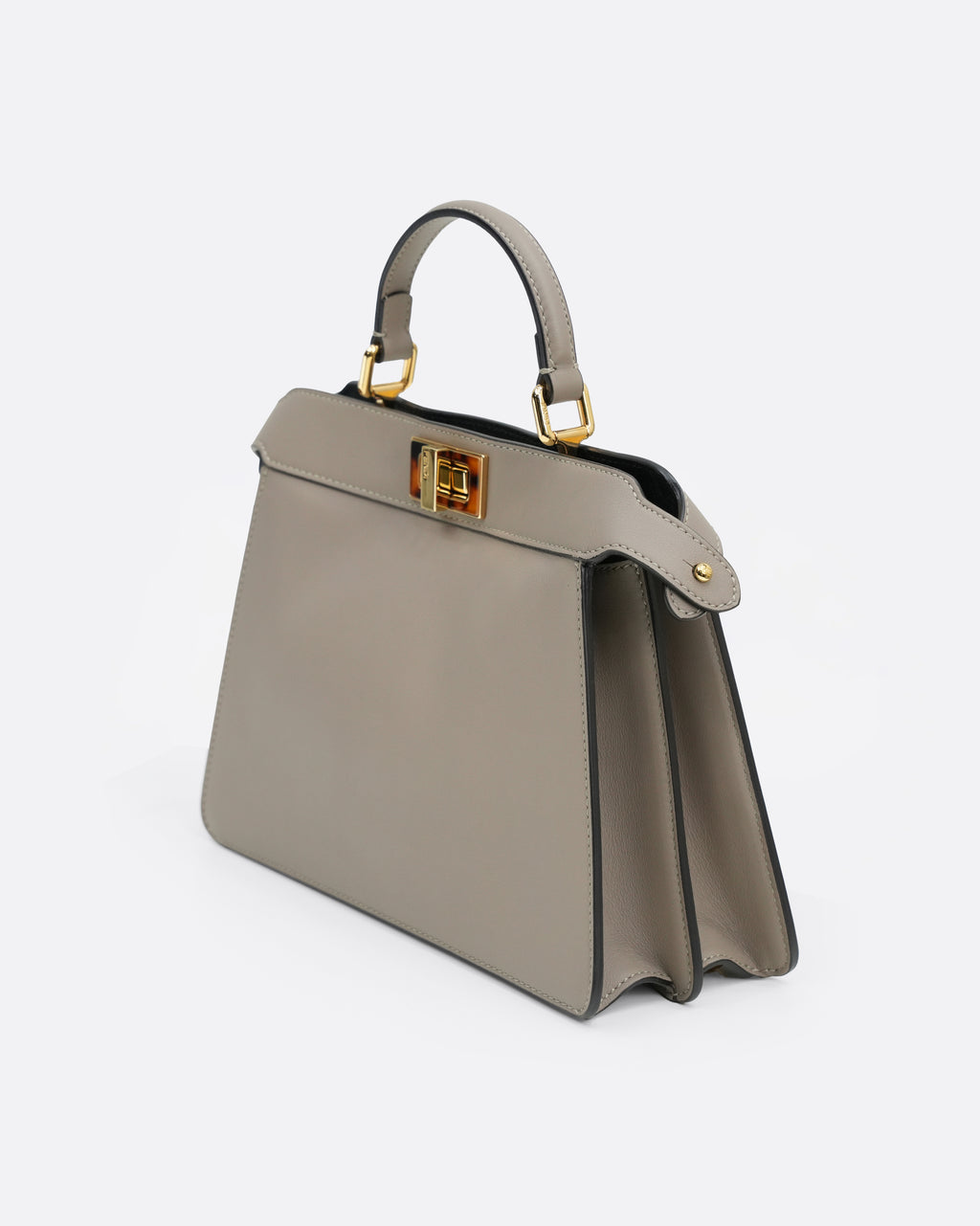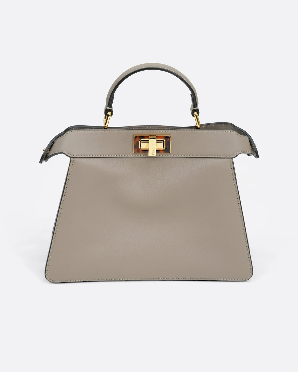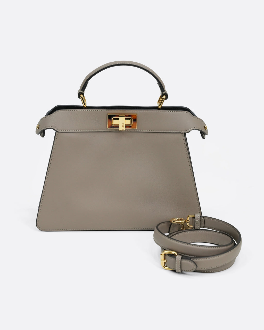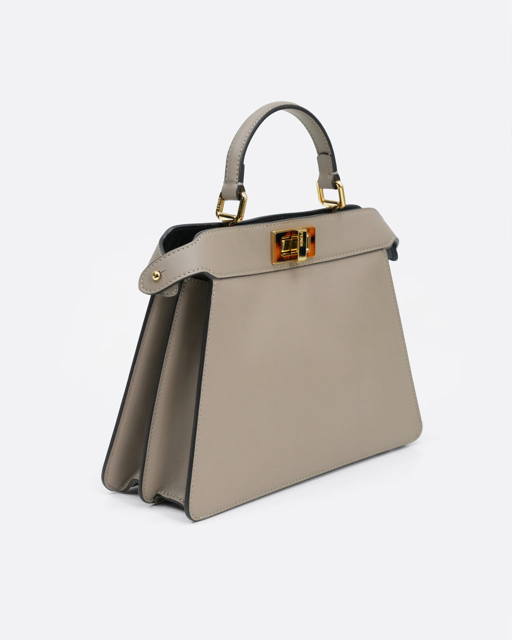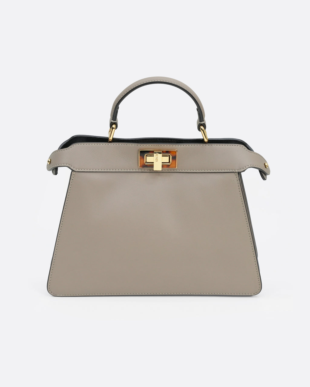 Peekaboo ISeeU Small bag in greige smooth leather with top handle and gold-tone twist lock. Elegant and structured, a refined design for timeless everyday sophistication.