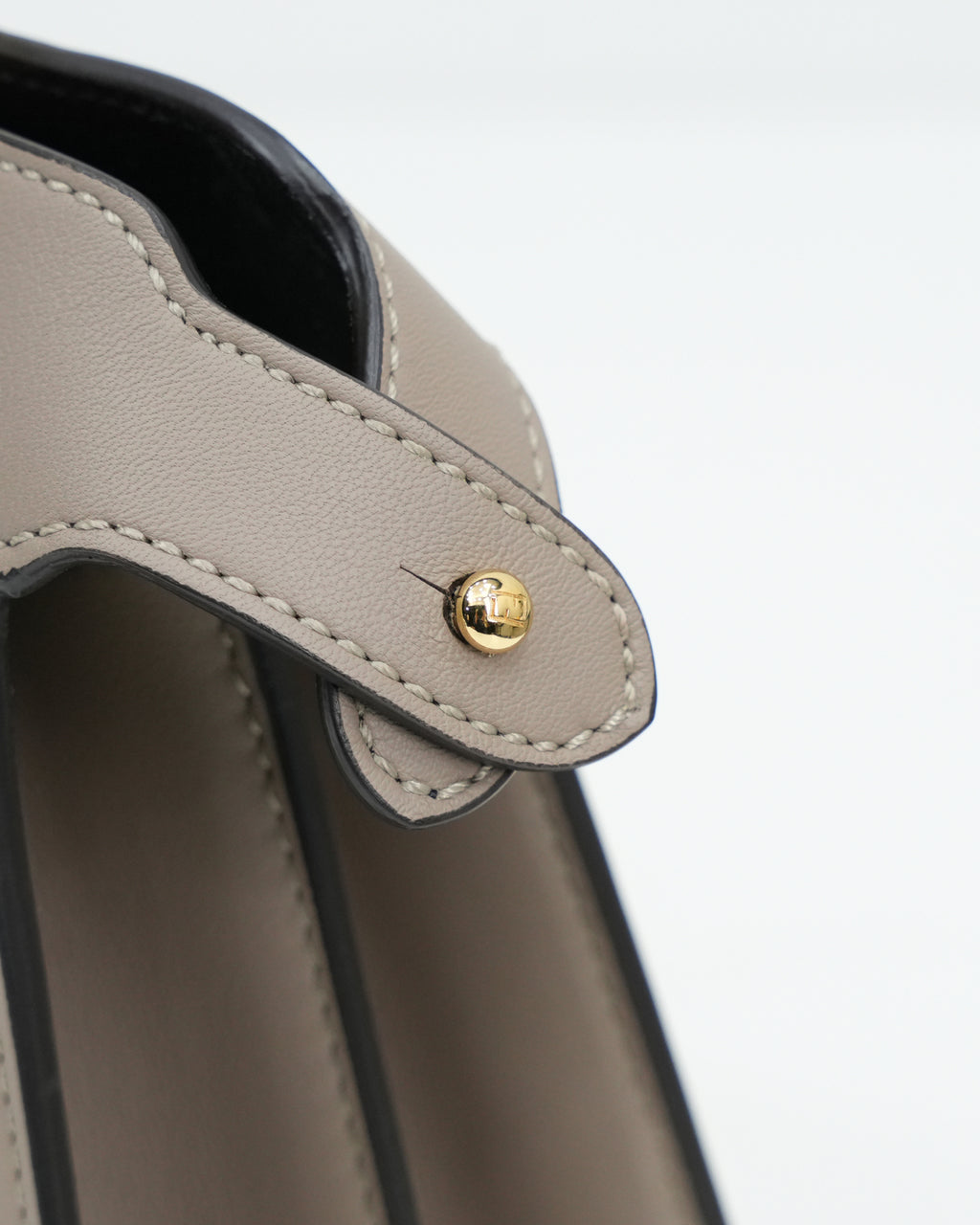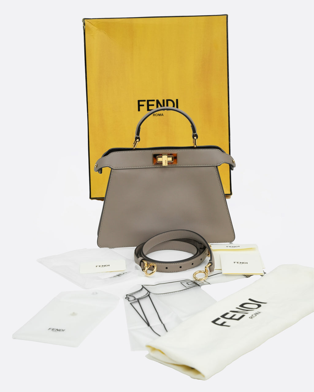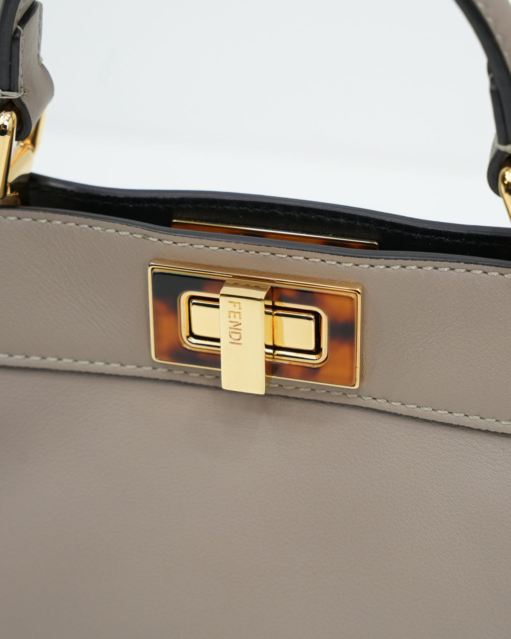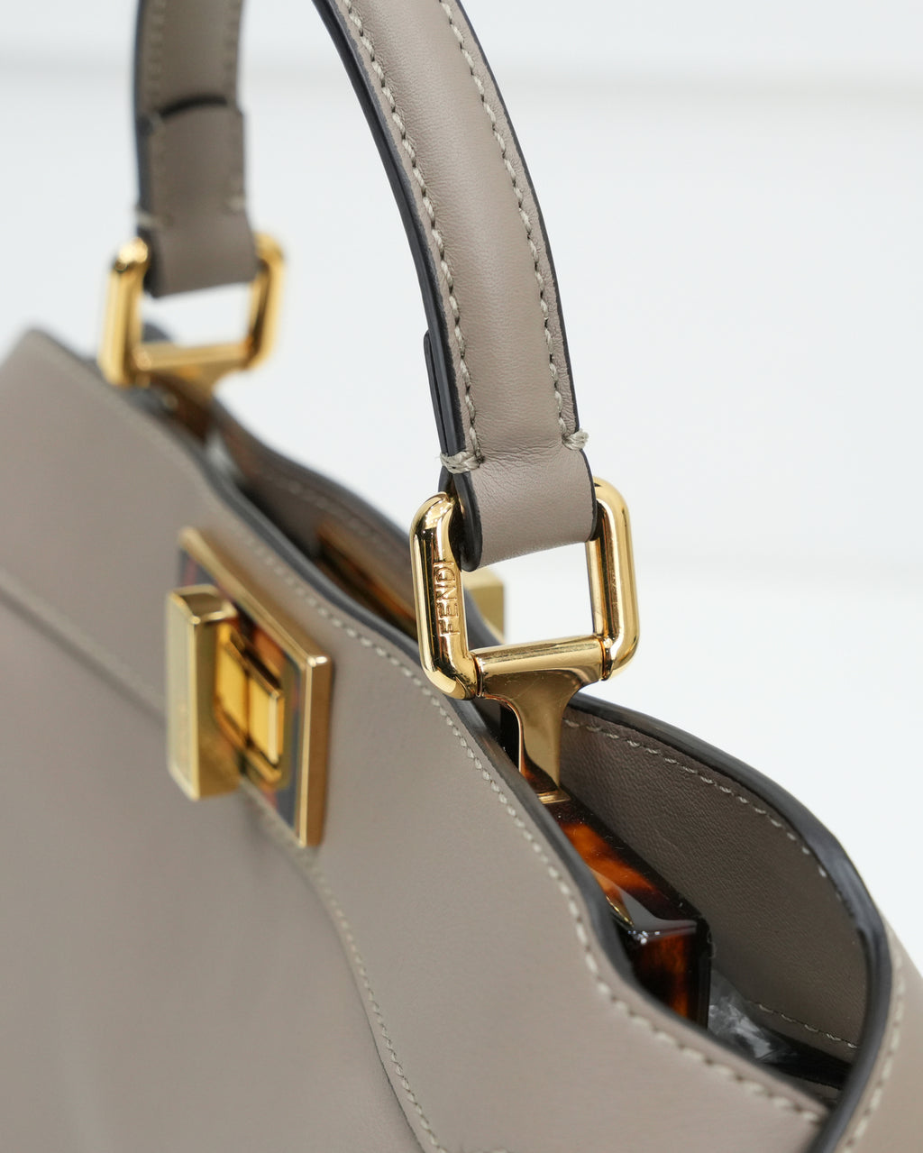 Peekaboo ISeeU Small bag in greige smooth leather with top handle and gold-tone twist lock. Elegant and structured, a refined design for timeless everyday sophistication.