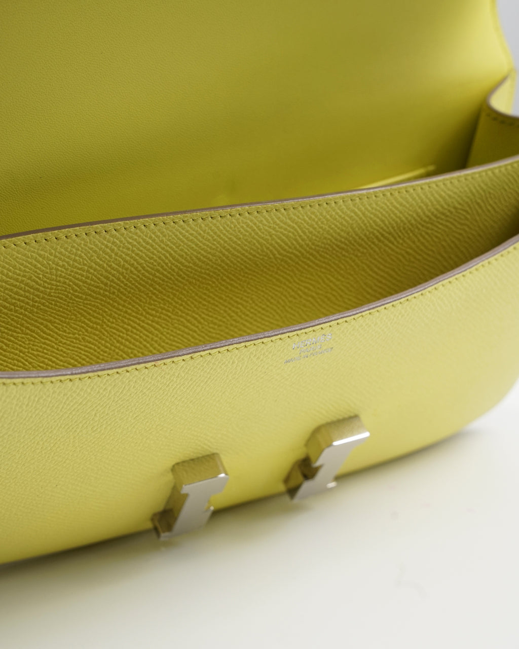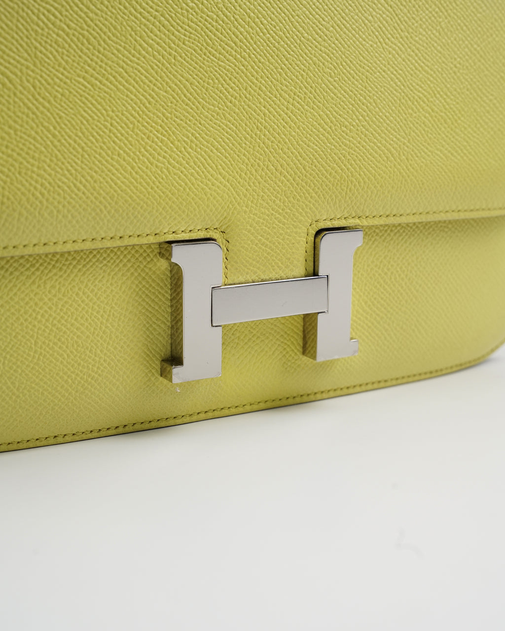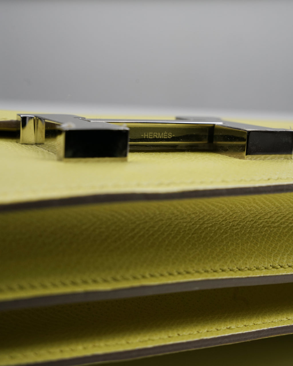 A striking Hermès Constance Élan in Soufre Epsom leather, featuring a structured silhouette and palladium-plated H clasp. Lightweight, elegant, and timeless, this piece brings a bold yet refined pop of color to any collection.
