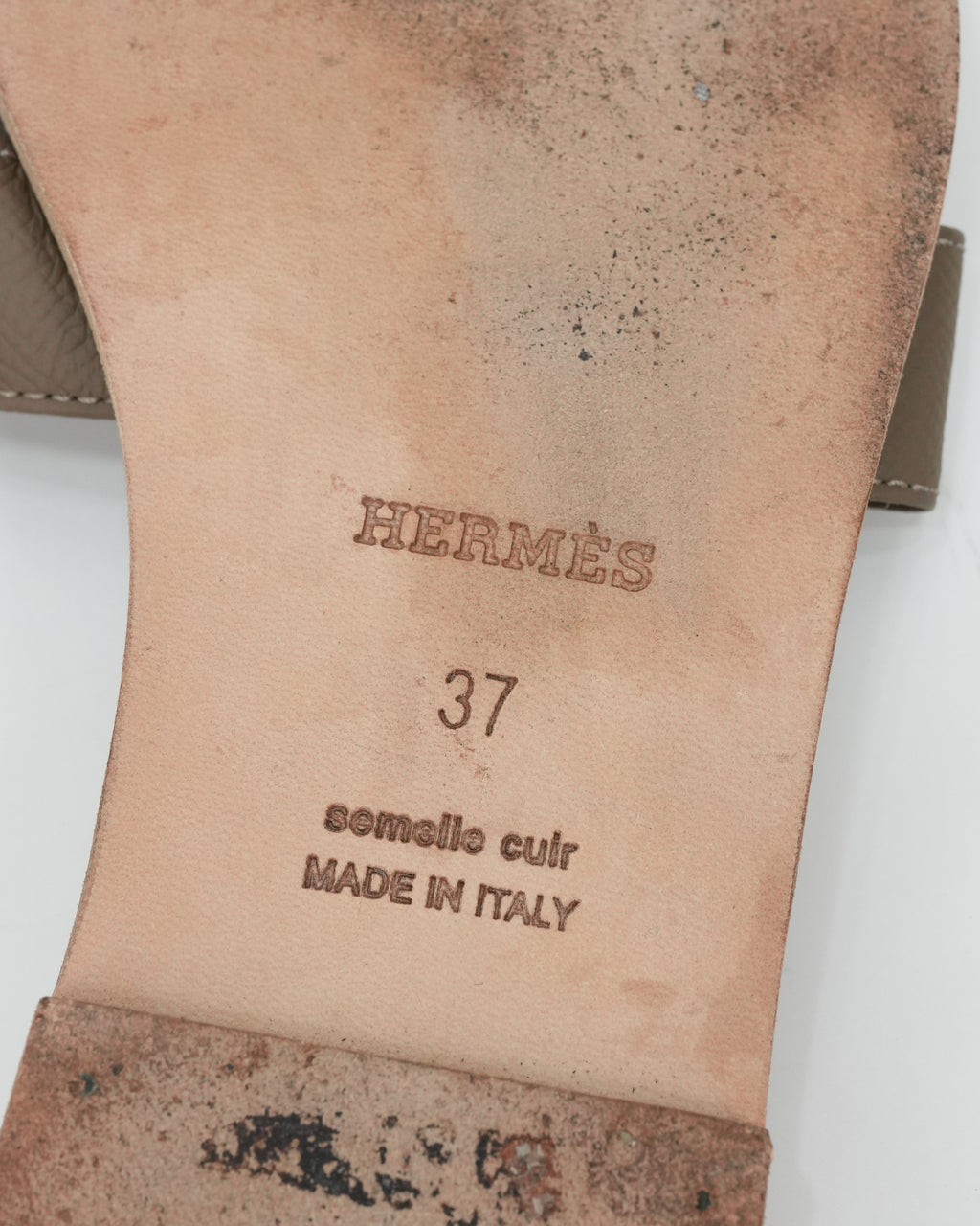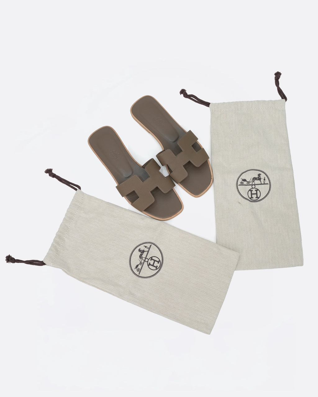 Hermès Oran sandals in Etoupe Epsom calfskin leather featuring the signature “H” cut-out strap. A timeless Hermès icon that embodies effortless elegance and comfort for chic everyday wear.