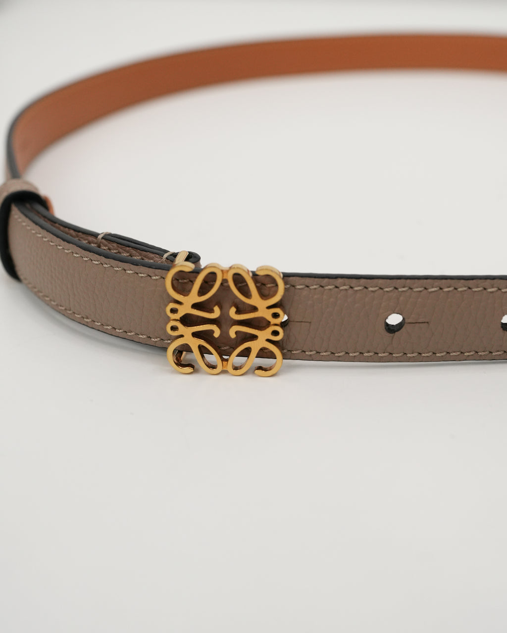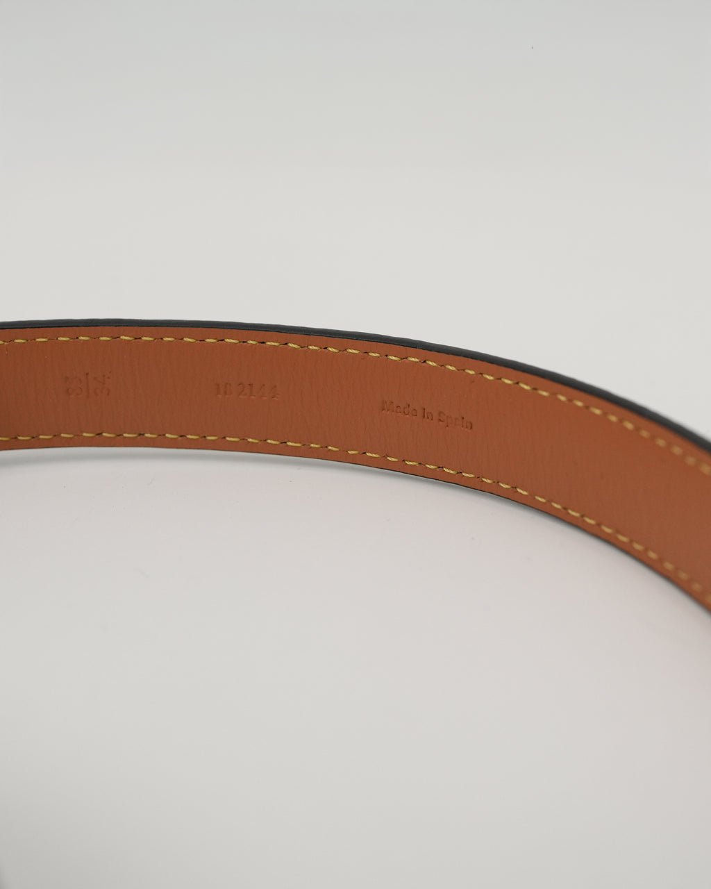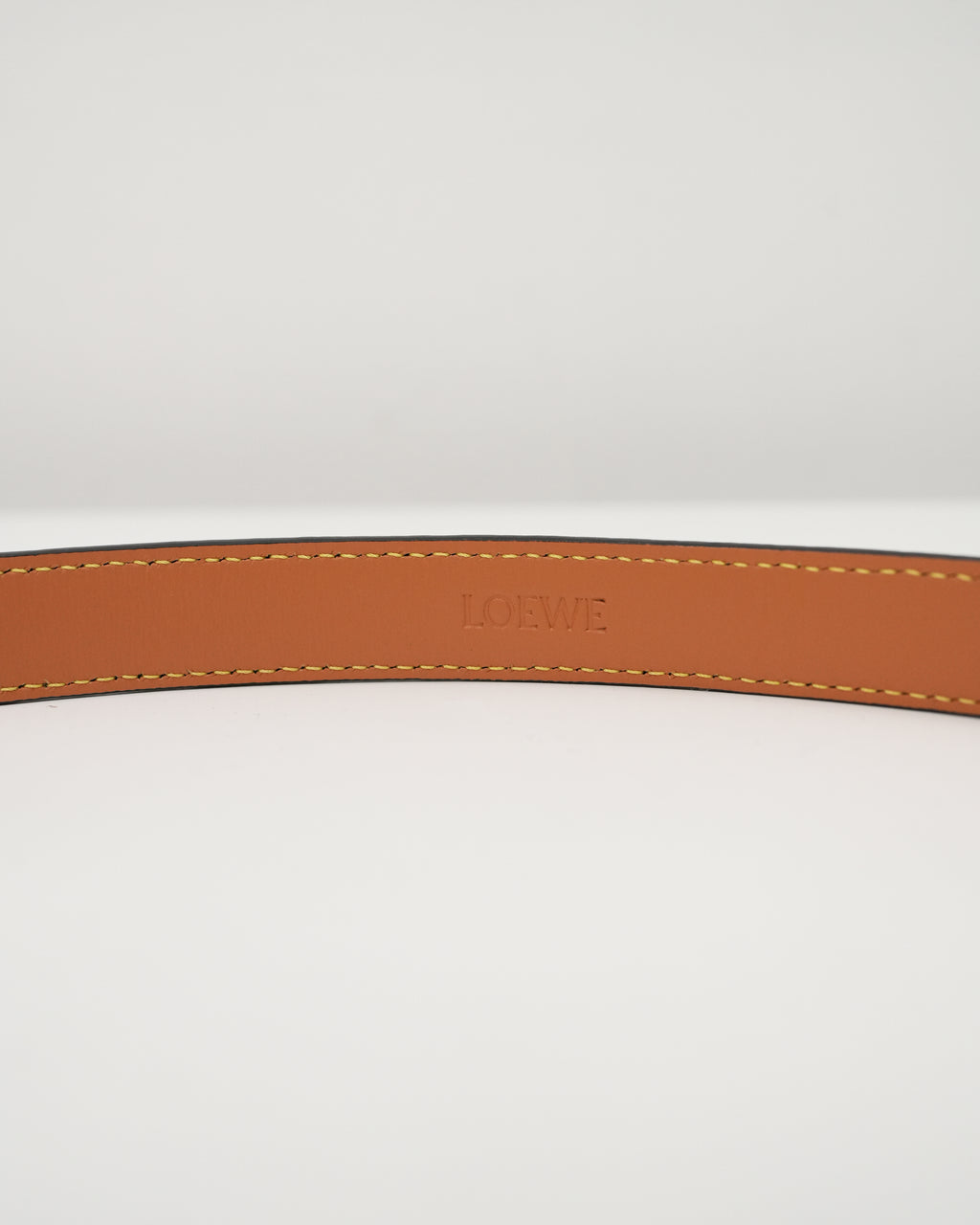 A refined Loewe leather belt crafted in grained calfskin with a contrasting tan interior. It features the iconic gold-tone Anagram buckle, slim adjustable strap, and clean edge finishing for a timeless, elegant look.