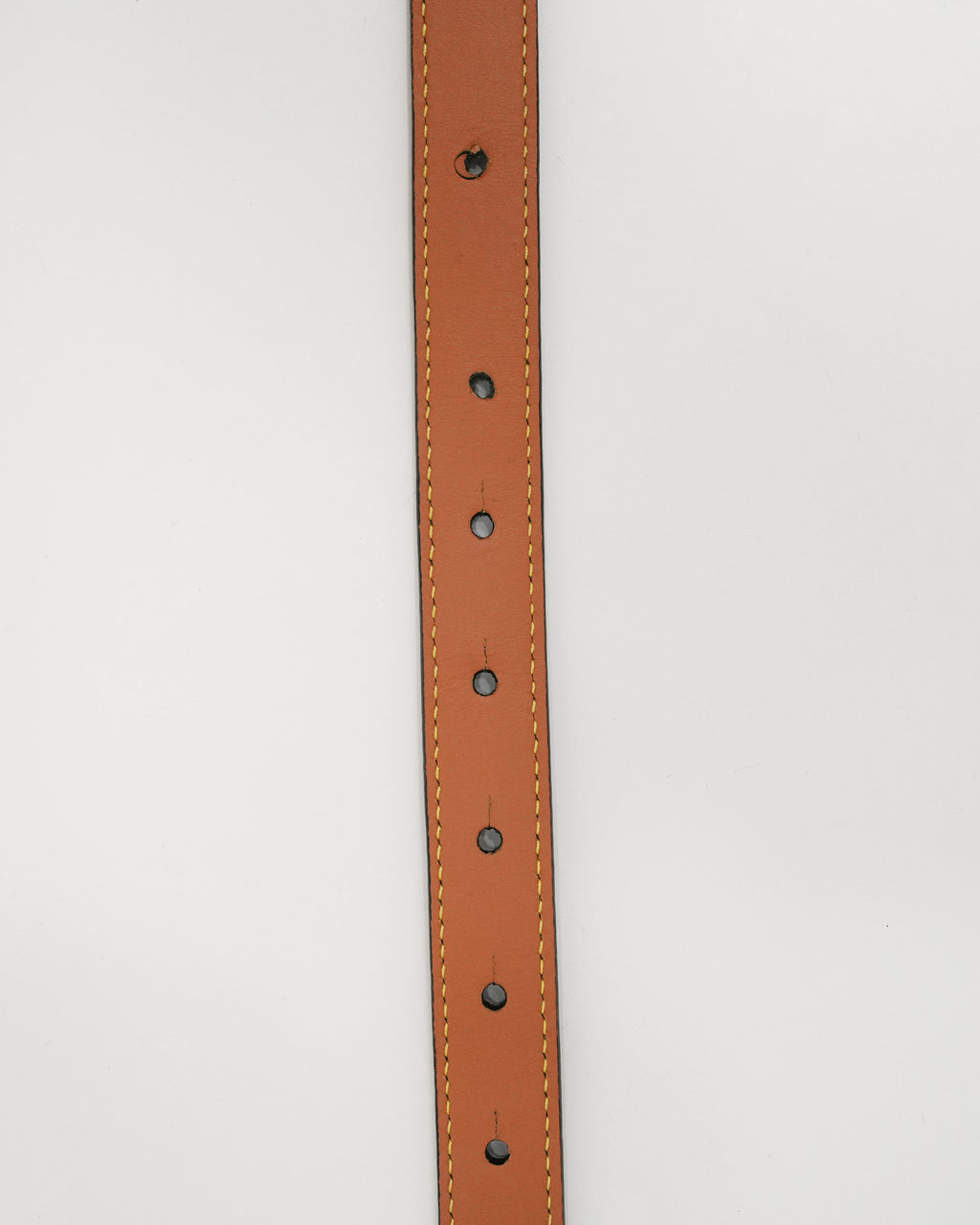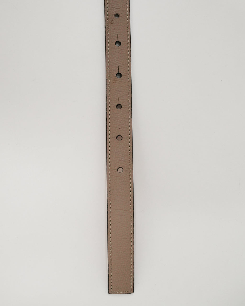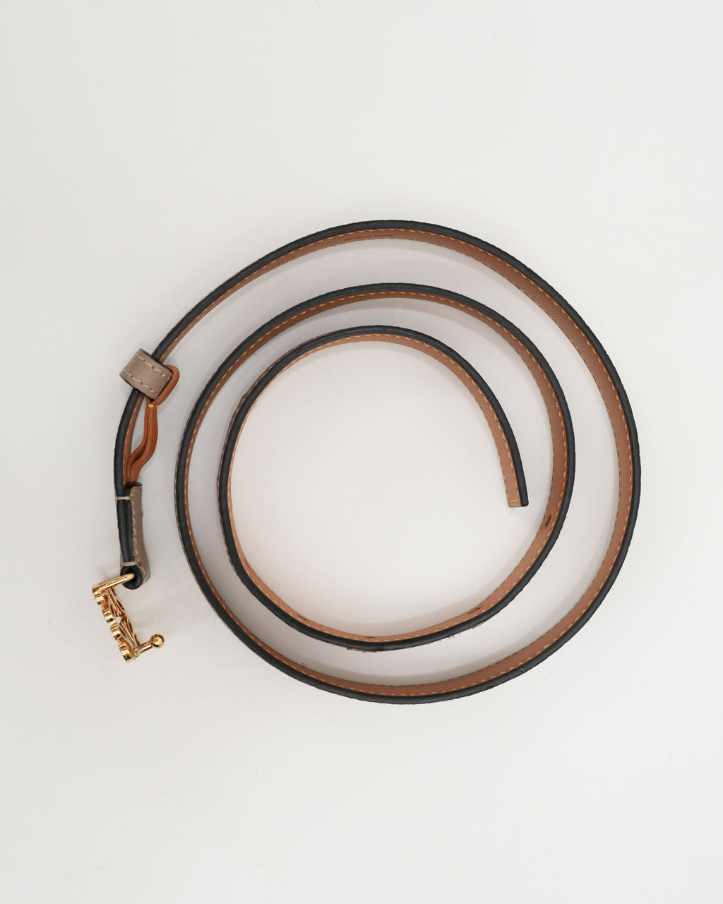 A refined Loewe leather belt crafted in grained calfskin with a contrasting tan interior. It features the iconic gold-tone Anagram buckle, slim adjustable strap, and clean edge finishing for a timeless, elegant look.