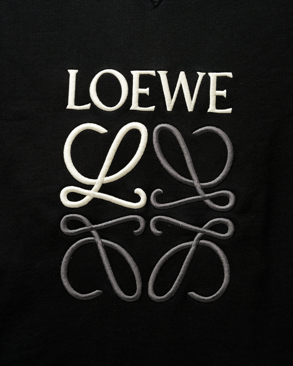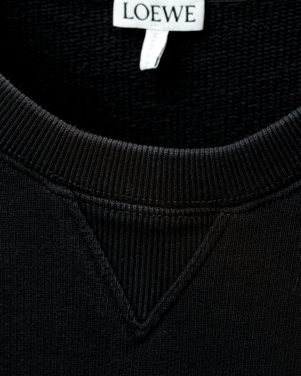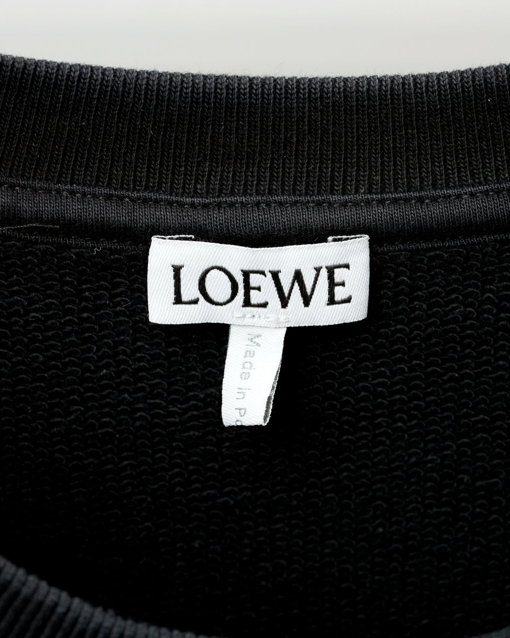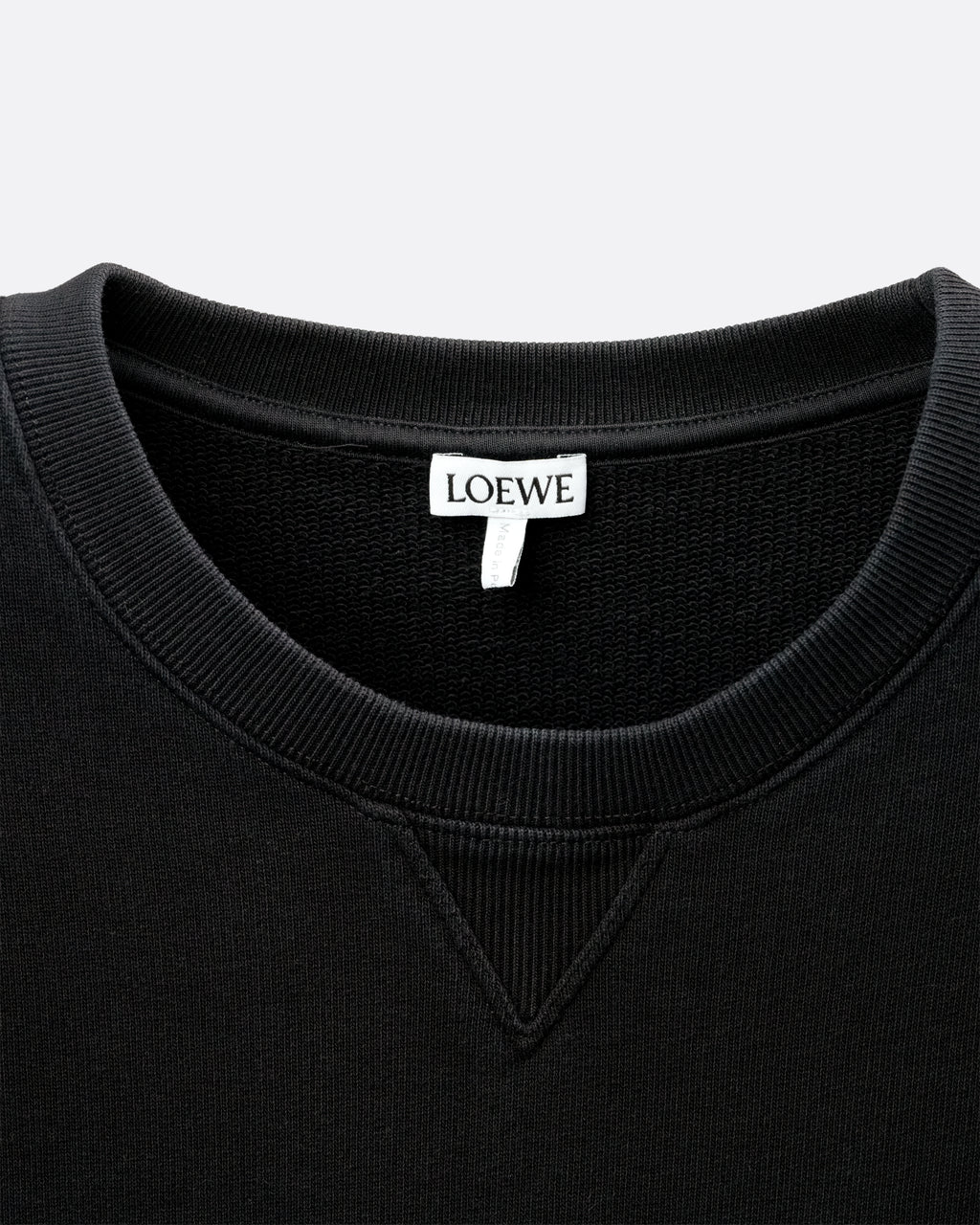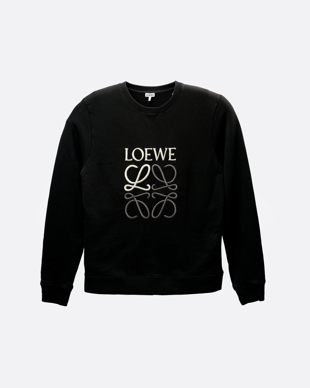 Black Loewe men’s sweatshirt featuring the iconic embroidered Anagram logo on the chest. Crafted from 100% premium cotton fleece with a regular fit cut, offering warmth, softness, and refined comfort for a timeless casual look.