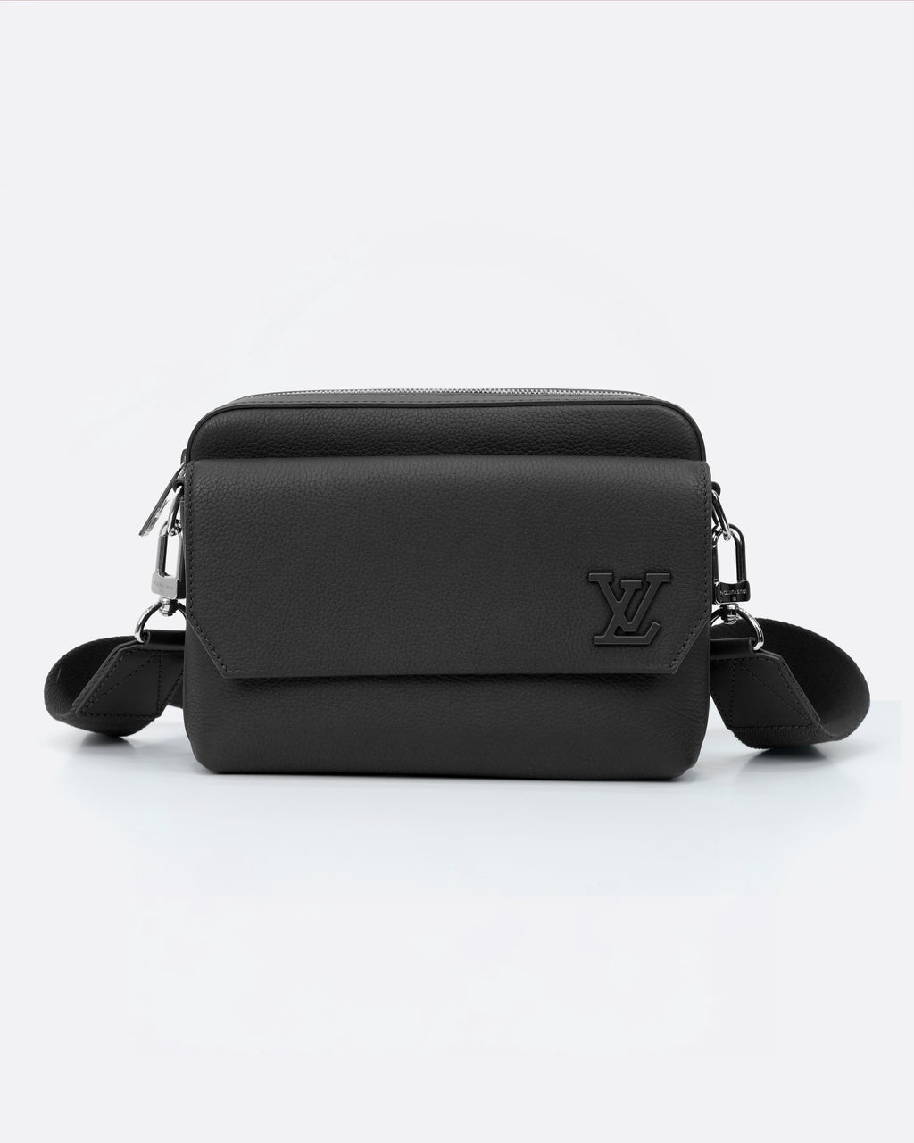 Louis Vuitton Fastline Messenger Bag in black leather featuring silver-tone hardware and LV logo detail. Designed for men, it combines luxury craftsmanship with sporty functionality for modern everyday wear.