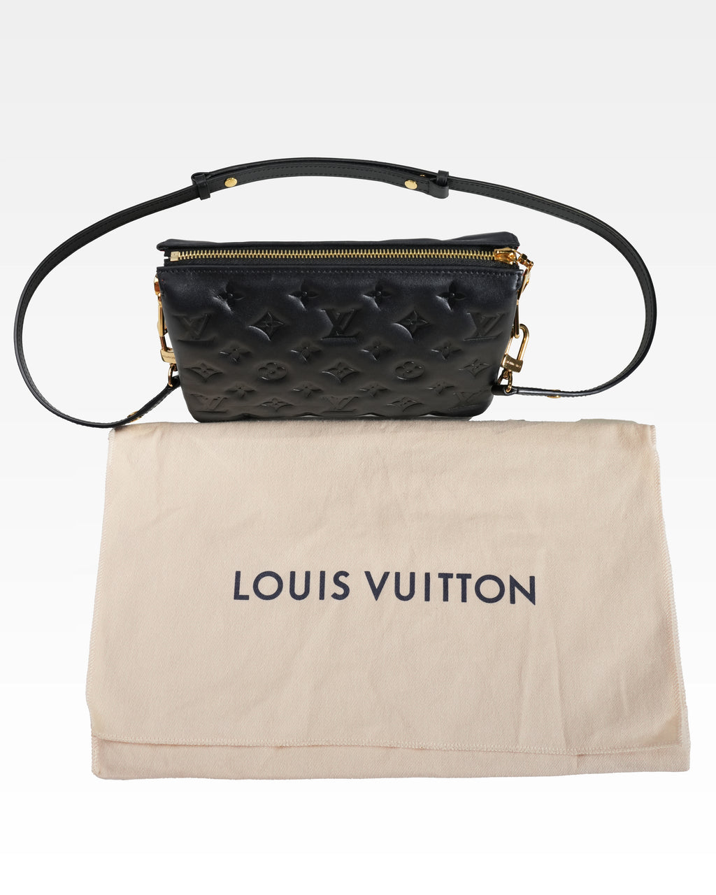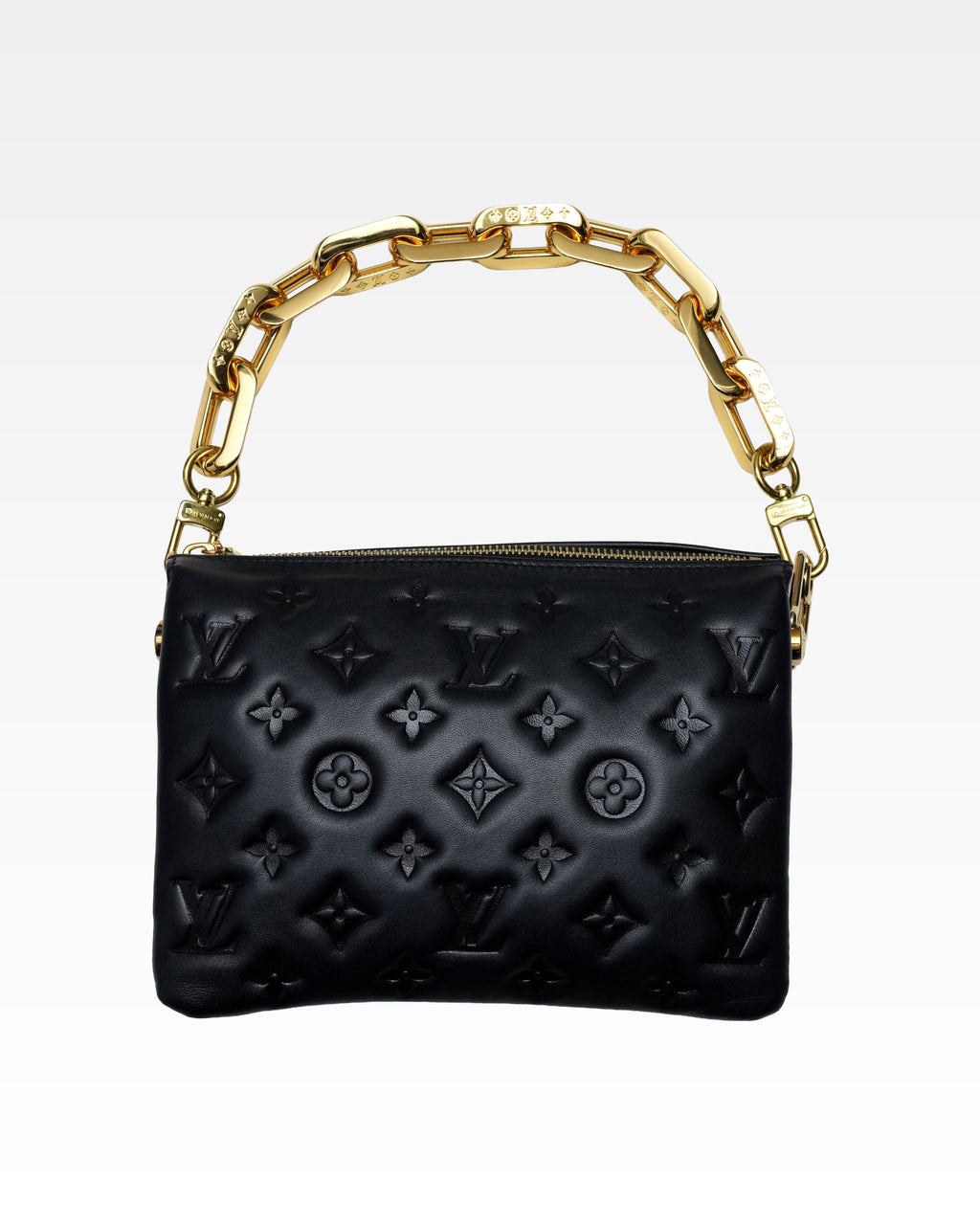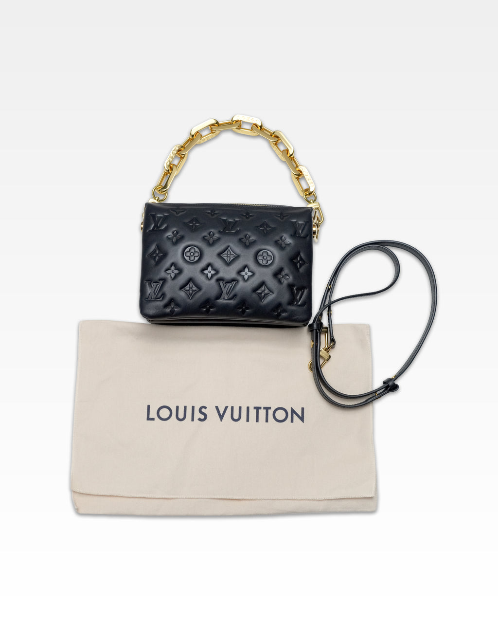The super soft and cushiony Coussin BB is an adorably compact handbag, fashioned from puffy lambskin embossed with the Monogram pattern. A chunky gold-color chain and a thin leather strap, both removable, enable different attitudes and carry options. 3 inside compartments add practicality, making this an ideal day-to-evening accessory.