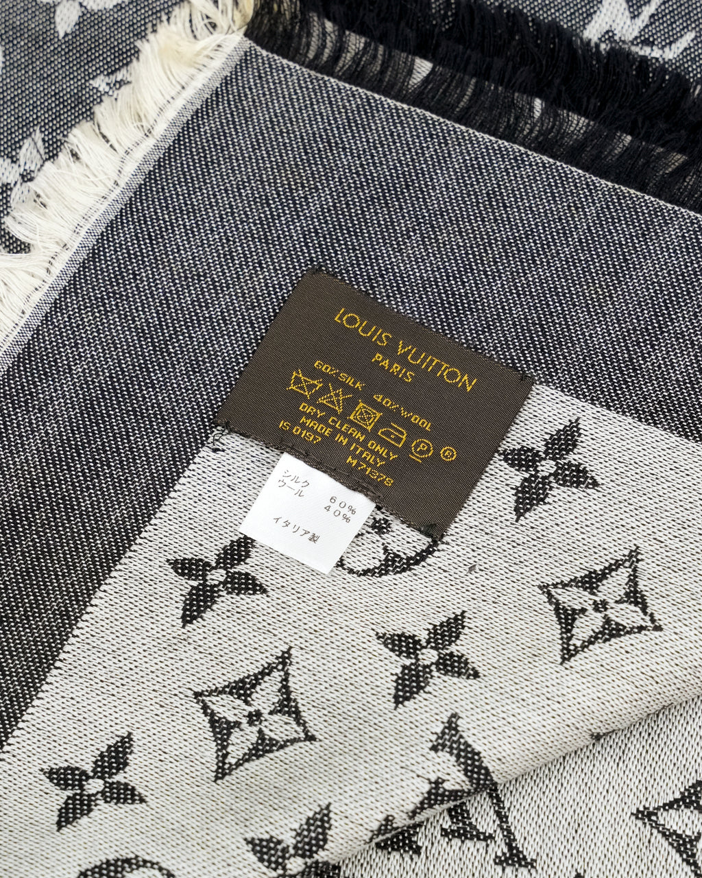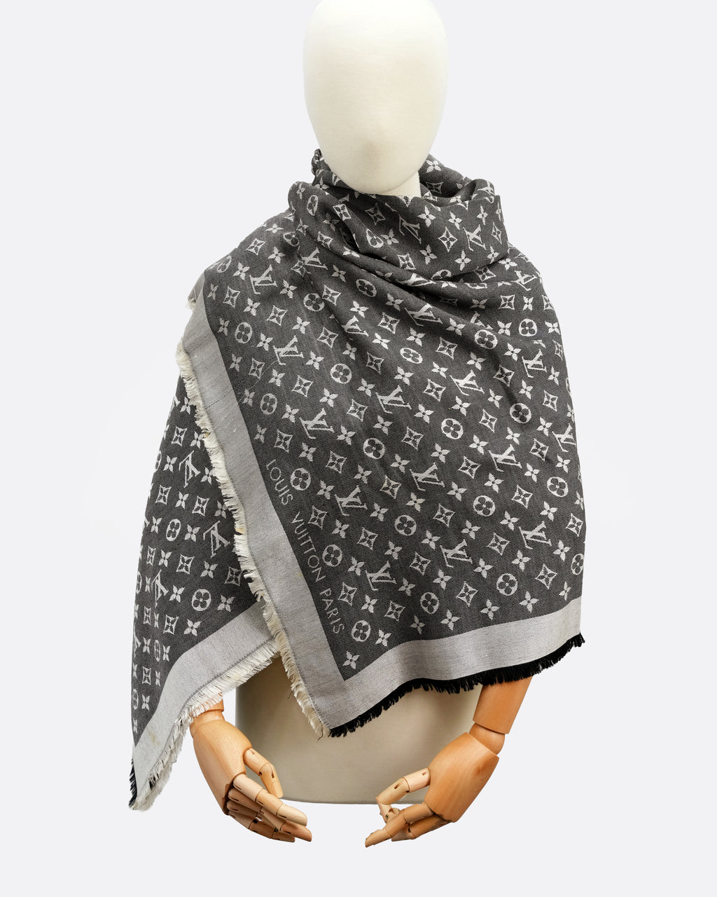 Monogram denim shawl in grey. Iconic and elegant with the signature pattern, a versatile accessory that adds timeless luxury to any look.