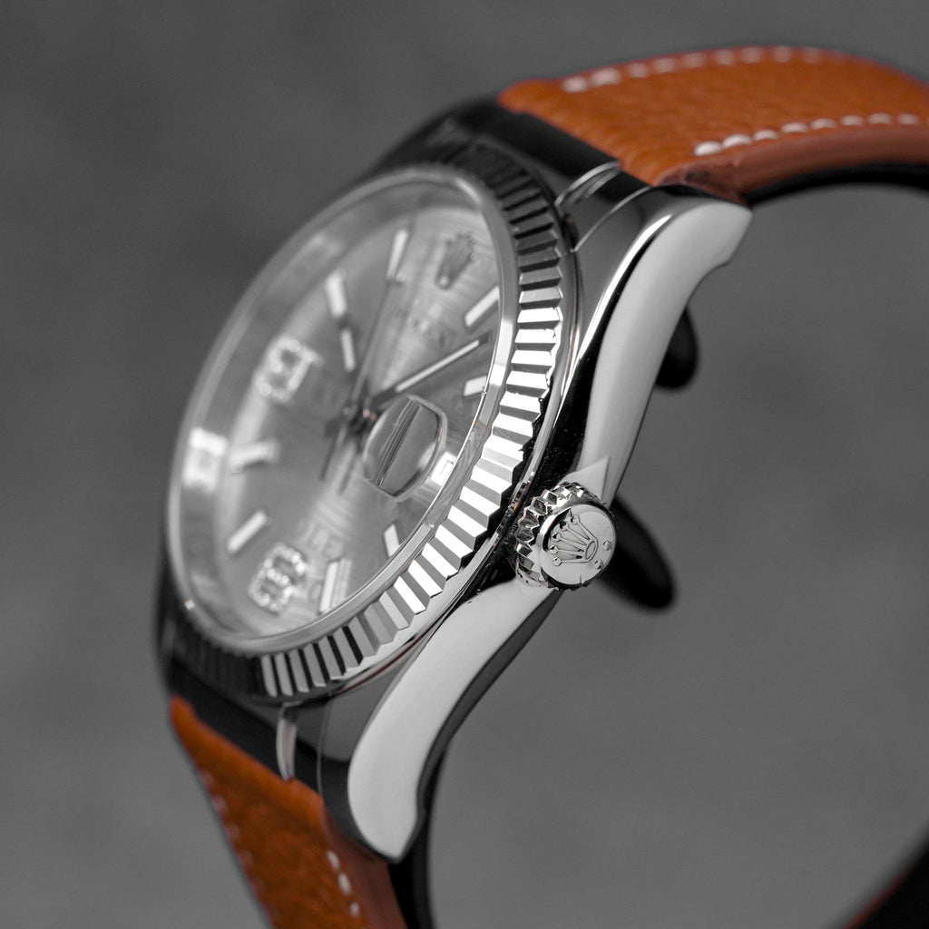 ROLEX DATEJUST 36MM SILVER WAVE DIAMOND ON 6 & 9 DIAL AFTERMARKET LEATHER STRAP