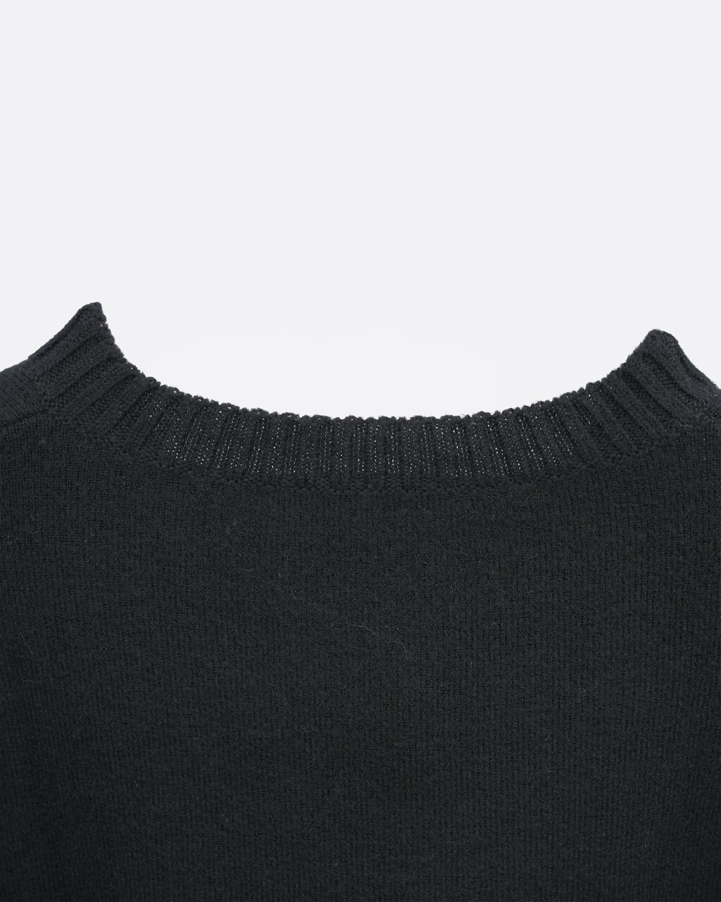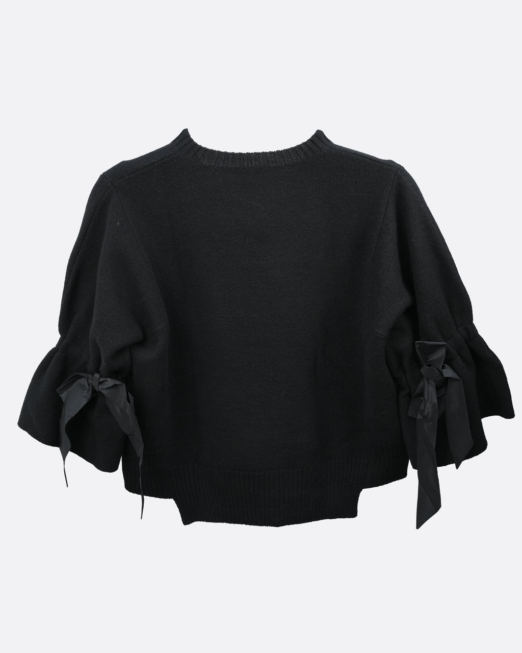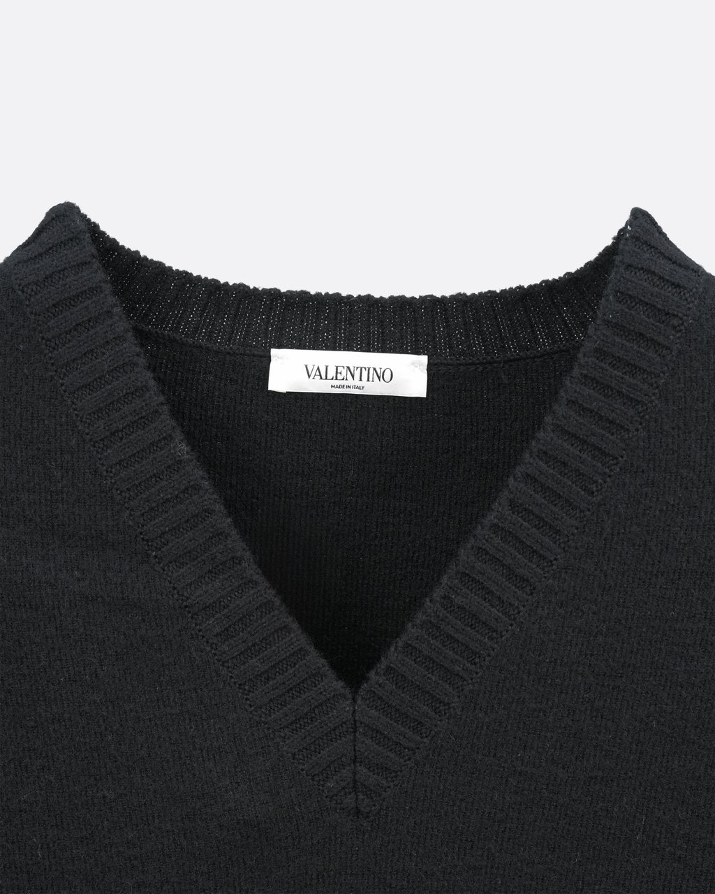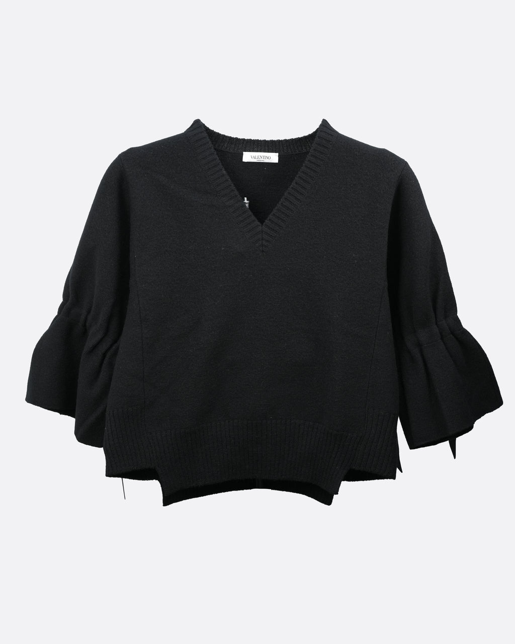 Valentino V-neck ruffle sleeve sweater in black wool blend featuring flared sleeves and ribbed hems. A refined yet statement knit that combines modern femininity with Valentino’s timeless craftsmanship.
