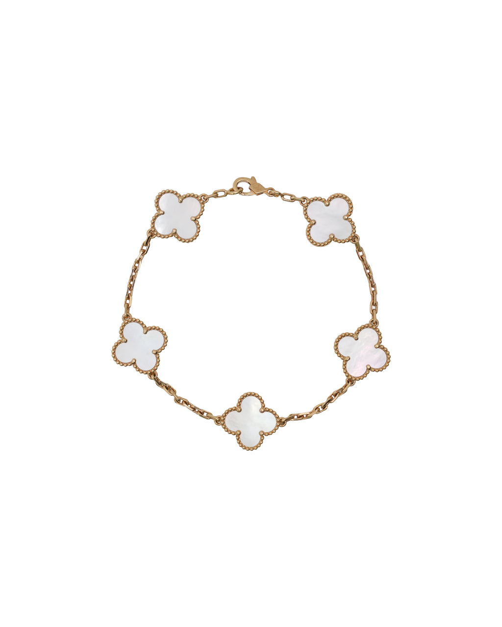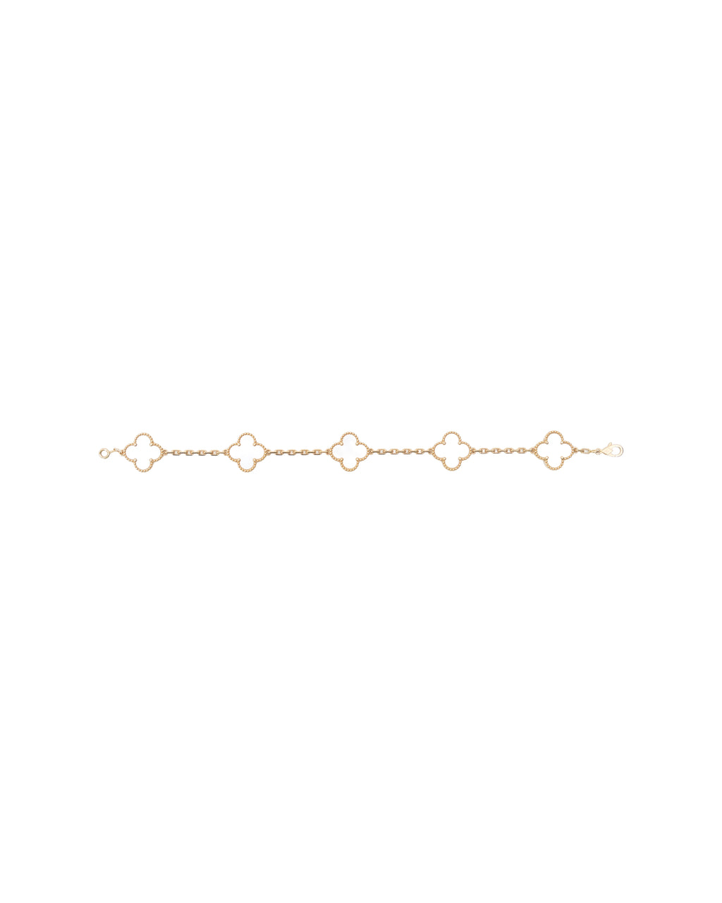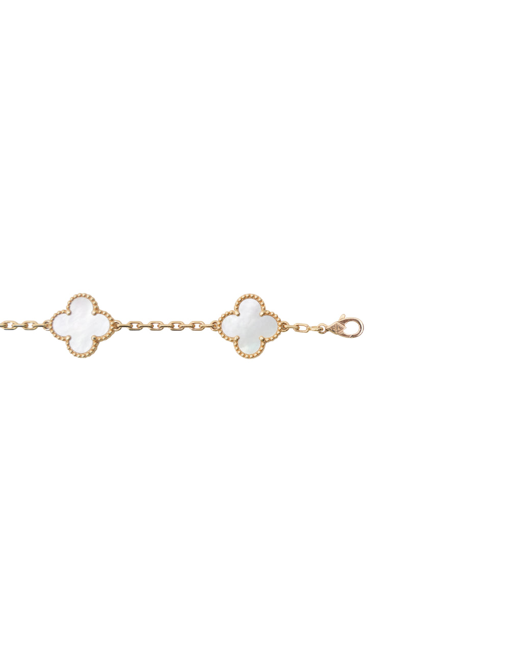 The Van Cleef & Arpels Vintage Alhambra 5 Motifs bracelet is crafted in 18K yellow gold and set with luminous white mother-of-pearl clover motifs. Framed by the Maison’s signature beaded edges, it embodies timeless elegance and refined craftsmanship.