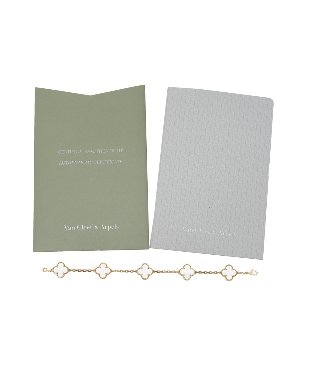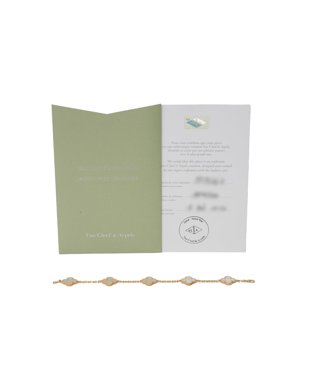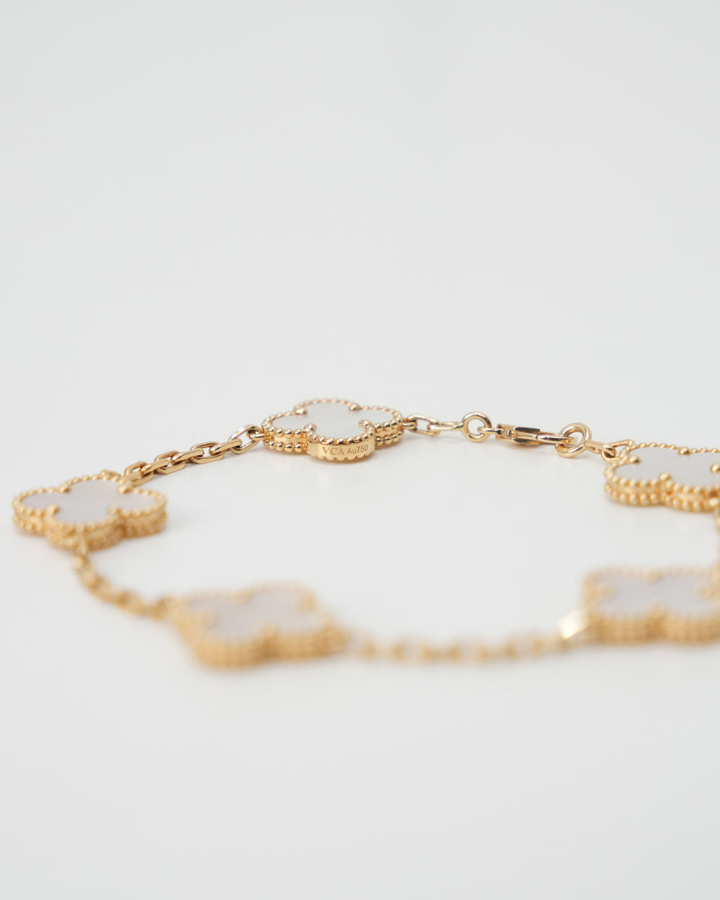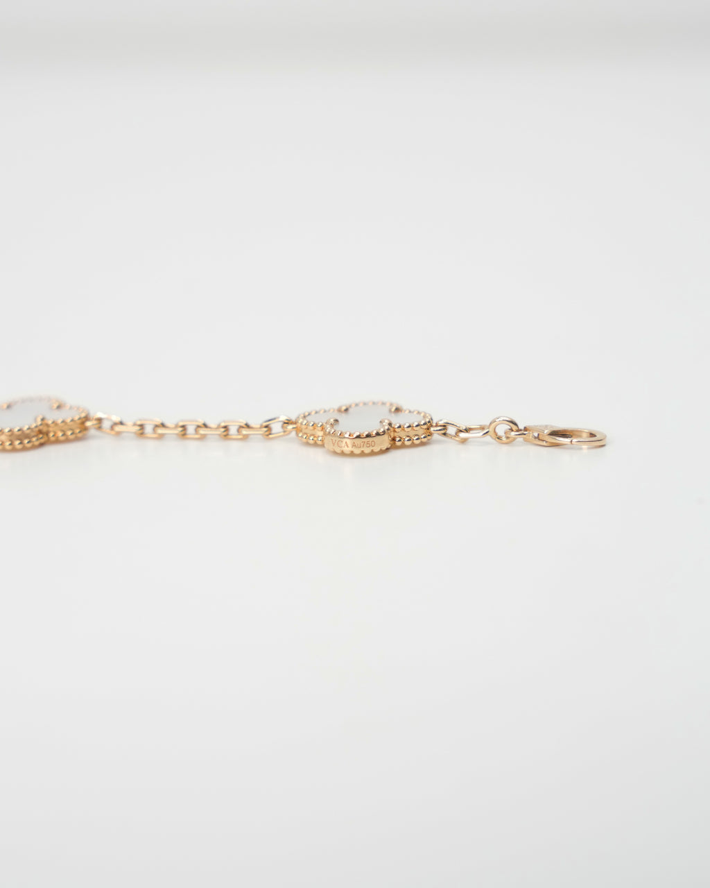 The Van Cleef & Arpels Vintage Alhambra 5 Motifs bracelet is crafted in 18K yellow gold and set with luminous white mother-of-pearl clover motifs. Framed by the Maison’s signature beaded edges, it embodies timeless elegance and refined craftsmanship.
